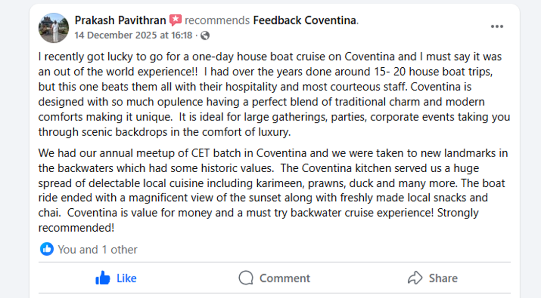 Step aboard Coventina, a 100 ft × 22 ft double-decker luxury houseboat on Vembanad Lake. Designed for premium group travel, it offers unmatched comfort, elegance, and flexibility for both leisure and events.